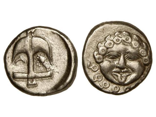 GREEK COINS - Dracma. 450-400 a.C. APOLONIA PÓNTICA. Anv.: Ancla, A y cangrejo. Rev.: Cabeza de Gorgona de frente. 2,90 grs. AR. Se-1655 var. EBC-.