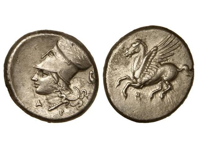 GREEK COINS - Estátera. 350-306 a.C. CORINTO. Anv.: Pegaso volando a izquierda, debajo . Rev.: Cabeza de Atenea con casco corintio, alrededor letras y símbolo. 8,40 grs. AR. Se-2629 var. EBC-.