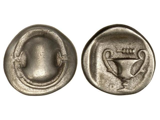 GREEK COINS - Hemidracma. 379-371 a.C. BEOCIA. Anv.: Escudo beocio. Rev.: Cántaro dentro de cuadro incuso. 2,50 grs. AR. Se-2385 var. MBC+/MBC.