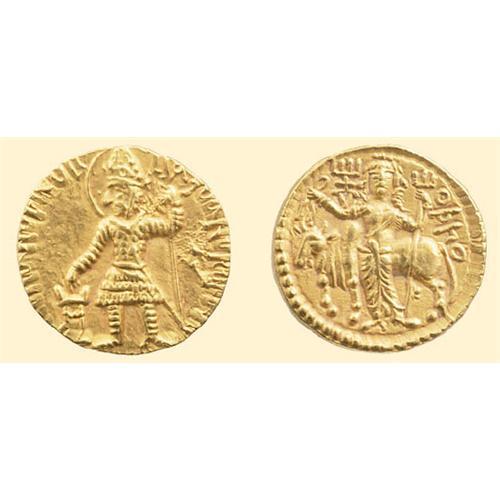 AV Dinar (7.97 g). Vasudeva, nimbate and dressed in armor, sacrificing over altar / ithyphallic Siva standing frontally, holding trident and lotus, the bull Nandi behind, tamgha above.