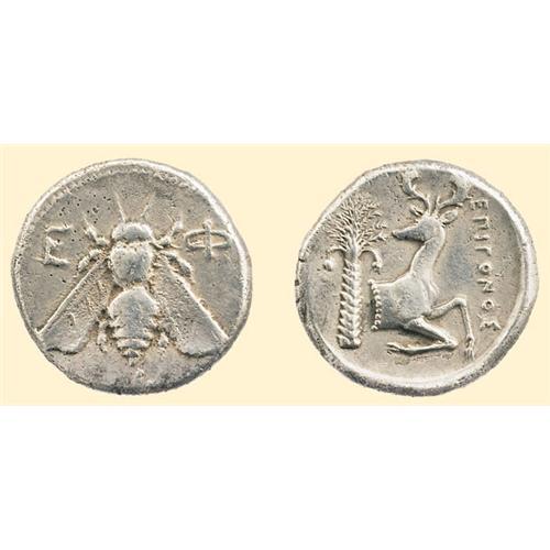AR Tetradrachm (15.07 g). Ca. 387-295 BC. bee as seen from above / <SPAN STYLE=`FONT-SIZE:10.0PT;FONT-FAMILY:SYMBOL;COLOR:#333333`>EPIGONOS</SPAN>, forepart of stag right, head turned left, palm tree behind. Head, Ephesus, p. 34. BMC-. SNG von Aulock-.