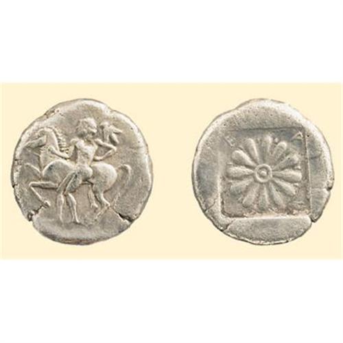 AR Drachm (4.42 g). Ca. 500-450 BC. Nude man left, restraining horse by the reins; bird in flight above / flower, ethnic in angles, all in shallow incuse square. Dewing 2279var. BMC 20var.