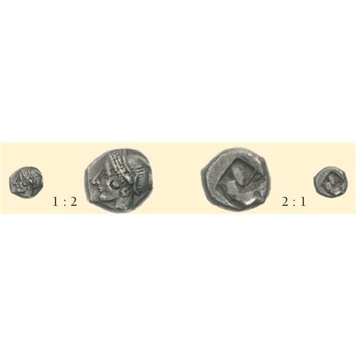 AR Trihemiobol (1.26 g). Ca. 500 BC. Woman`s head left in Greek Archaic style / incuse square. Rosen 595-596.