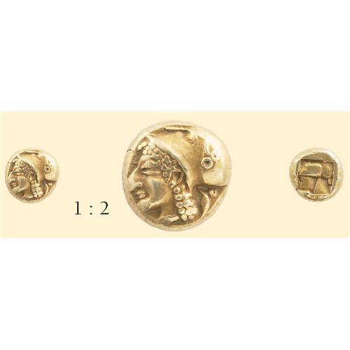 EL Hekte (2.59 g). Ca. 521-478 BC. Head l. of Athena left, wearing a Corinthian helmet; seal behind / quadripartite incuse square. Bodenstedt Ph 32 or 41; Boston 1906; Rosen 591 (or var.). A pleasing Greek archaic style head of Athena.