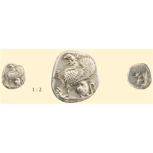 AR Drachm (7.35 g). Ca. 540-578 BC. Gryphon standing left, right paw raised / quadripartite incuse square.
