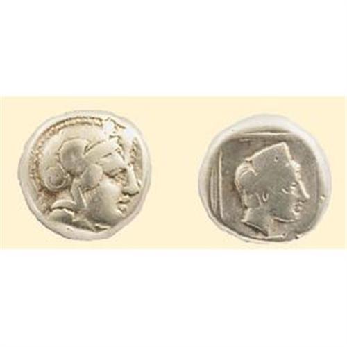 EL Hekte (2.50 g). Ca. 412-378 BC. Head of Athena right, wearing crested Attic helmet with cheekpiece raised / Head of Hera right, wearing stephane, all in raised square border. Bodenstedt My 73; BMC 108; Boston 1709.