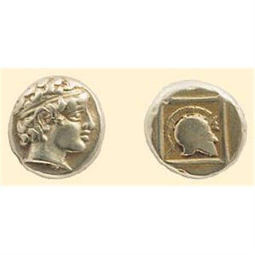 EL Hekte (2.54 g). Ca. 454-427 BC. Head of youth right, wearing taenia / crested, laureate Corinthian helmet right, M before, all in raised square border. Bodenstedt My 40; Boston 1699; BMC 55. This issue is unusual and remarkable for the inclusion of the M on the reverse, as a mint signature.