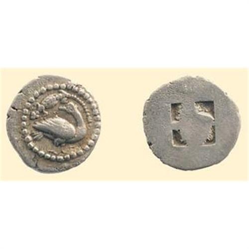 AR Diobol (0.93 g). 5th century BC. Goose and lizard / shallow quadripartite incuse square. SNG Cop. 178. SNG Ash. 2262.