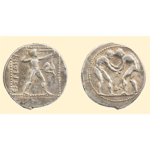 AR Stater (10.90 g). Ca. 380-325 BC. Two wrestlers facing off, <SPAN STYLE=`FONT-SIZE:10.0PT;FONT-FAMILY:SYMBOL;COLOR:#333333`>DA</SPAN> between them / <SPAN STYLE=`FONT-SIZE:10.0PT;FONT-FAMILY:SYMBOL;COLOR:#333333`>ESTFEDIIU</SPAN>, slinger right, readying to discharge bullet, triskeles in front. SNG von Aulock 4539-4543.