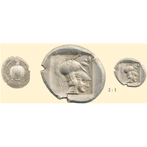AR Stater (10.62 g). Ca. 430-400 BC. Pomegranate / helmeted head of Athena right, olive branch in front, all within incuse square. BMC 19.144, 8; Atlan 42 (same dies). A superlatively rendered head of the goddess Athena.
