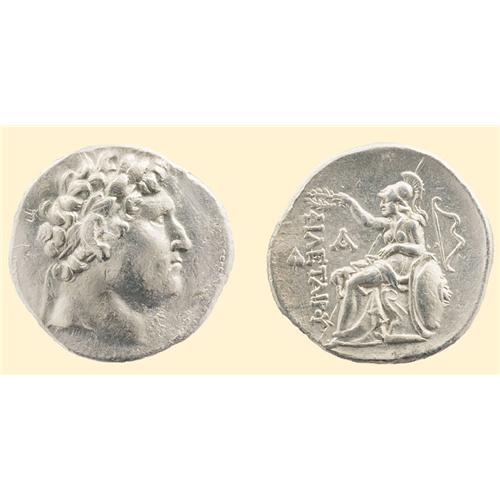 AR Tetradrachm (16.47 g). <SPAN STYLE=`FONT-SIZE:10.0PT;FONT-FAMILY:SYMBOL;COLOR:#333333`>FILETAIROU</SPAN>, laureate head of Philetairos left / Athena seated left on throne, holding scepter, leaning against shield, and crowning royal name; A and ivy leaf before. Westermark Group IVa (as Attalus I; reverse die seemingly unlisted). SNG France 5, 1610-1615 (as Eumenes I).