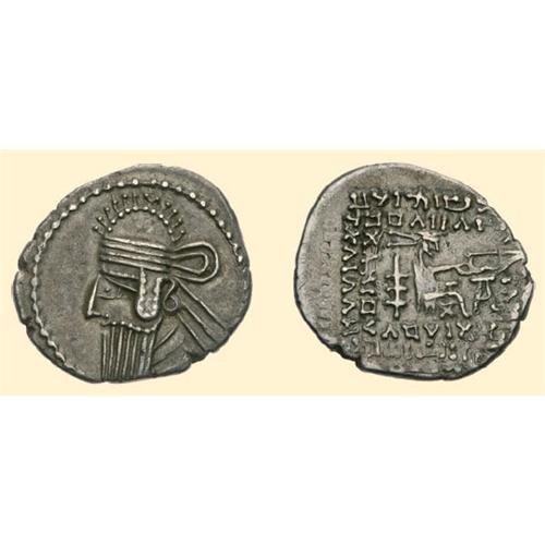 Vologases IV, 147-191 AD. AR Drachm (3.40 g) Ecbatana. Bust of Vologases left / <SPAN STYLE=`FONT-SIZE:10.0PT;FONT-FAMILY:SYMBOL;COLOR:#333333`>BASILEWS / BASILEWN / MEGALOU / ARSAKOU / EPIFANOUS</SPAN>, Arsaces seated left, holding a bow. Sell. 84.124.