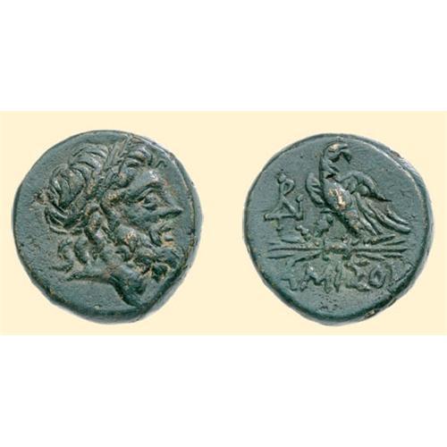 AE 20 (8.15 g). 85-65 BC. Bearded head of Zeus right / <SPAN STYLE=`FONT-SIZE:10.0PT;FONT-FAMILY:SYMBOL;COLOR:#333333`>AMISOU</SPAN>, eagle on thunderbolt left, his head turned right, monogram <SPAN STYLE=`FONT-SIZE:10.0PT;FONT-FAMILY:SYMBOL;COLOR:#333333`>RDI</SPAN> in field. Rec. Gen. 15; SNG BM 1221; SNG Stancomb 705.