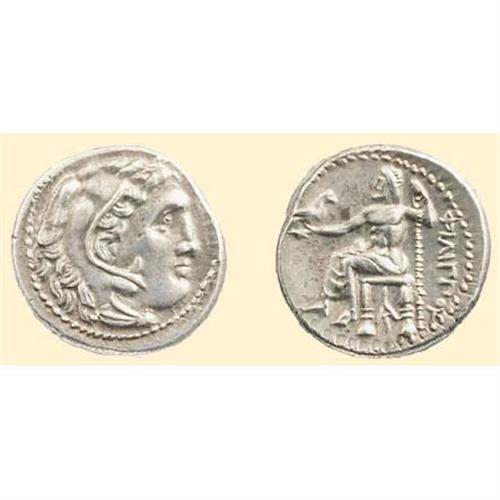 AR Drachm (4.24 g). Magnesia ad Maeandrum. 323-319 BC. Head of young Herakles right, wearing lion skin / <SPAN STYLE=`FONT-SIZE:10.0PT;FONT-FAMILY:SYMBOL;COLOR:#333333`>FILLIPPOU</SPAN>, Zeus enthroned left, holding eagle and scepter, <SPAN STYLE=`FONT-SIZE:10.0PT;FONT-FAMILY:SYMBOL;COLOR:#333333`>LU</SPAN> monogram below throne. Price P57.