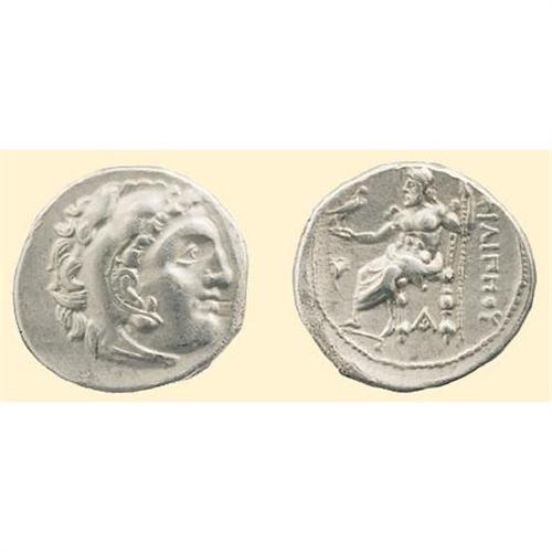 AR Drachm (4.19 g). Sardes. 323-319 BC. Head of young Herakles right, wearing lion skin / <SPAN STYLE=`FONT-SIZE:10.0PT;FONT-FAMILY:SYMBOL;COLOR:#333333`>FILLIPPOU</SPAN>, Zeus enthroned left, holding eagle and scepter, rose to left, A monogram below throne. Price P106, same obverse die.