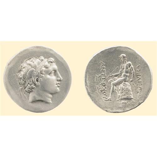 AR Tetradrachm (16.91 g). Alexandria Troas. Head Antiochus Hierax right, wearing winged diadem / <SPAN STYLE=`FONT-SIZE:10.0PT;FONT-FAMILY:SYMBOL;COLOR:#333333`>BASILEWS ANTIOCOU</SPAN>, nude Apollo seated on omphalos left, leaning on bow and testing arrow, inscriptions vertical in field, monograms to outside left, grazing horse in exergue. SC 877.8; Newell, WSM, 1583var.