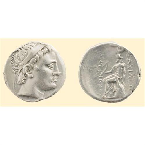 AR Drachm (4.18 g). Tralles(?). Diademed head of Antiochos II right / <SPAN STYLE=`FONT-SIZE:10.0PT;FONT-FAMILY:SYMBOL;COLOR:#333333`>BASILEWS ANTIOCOU</SPAN>, Apollo, nude to waist, seated left on omphalos, holding bow, inscriptions vertical in field, monograms to outer left and outer right. Cf. SC 536. Rare with this version of Apollo on a drachm.