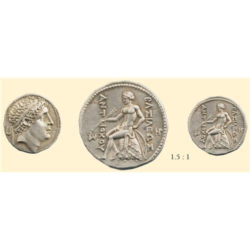 AR Tetradrachm (17.12 g). Diademed head of Antiochos II right / <SPAN STYLE=`FONT-SIZE:10.0PT;FONT-FAMILY:SYMBOL;COLOR:#333333`>BASILEWS ANTIOCOU</SPAN>, Apollo seated left on omphalos, holding arrows and leaning on bow, <SPAN STYLE=`FONT-SIZE:10.0PT;FONT-FAMILY:SYMBOL;COLOR:#333333`>PA</SPAN> monogram in outer left field, HP monogram in outer right field. SC 580.5 var. A superlative coin, virtually as struck from a die of exquisite style.