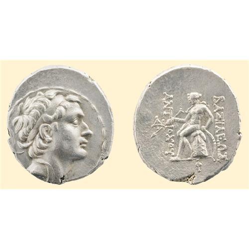 AR Tetradrachm (16.99 g). Antioch. Ca. 204-197 BC. Diademed head of Antiochos III right / <SPAN STYLE=`FONT-SIZE:10.0PT;FONT-FAMILY:SYMBOL;COLOR:#333333`>BASILEWS ANTIOCOU</SPAN>, nude Apollo seated on omphalos left, leaning on bow and testing arrow, inscriptions vertical in field, monograms to outside l. and in exergue. SC 1044.4(b); Newell, WSM, 1098.