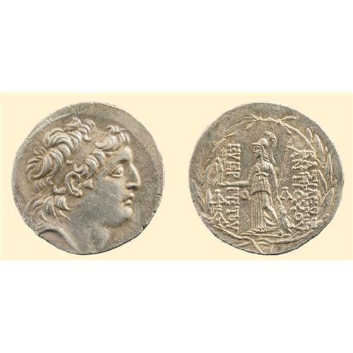 AR Tetradrachm, (16.36 g). Diademed head of Antiochos VII right / <SPAN STYLE=`FONT-SIZE:10.0PT;FONT-FAMILY:SYMBOL;COLOR:#333333`>BASILEWS ANTIOCOU EUERGETOU</SPAN>, Athena standing left, holding Nike, shield and lance, monogram in left field, <SPAN STYLE=`FONT-SIZE:10.0PT;FONT-FAMILY:SYMBOL;COLOR:#333333`>O</SPAN> and <SPAN STYLE=`FONT-SIZE:10.0PT;FONT-FAMILY:SYMBOL;COLOR:#333333`>L</SPAN> around Athena, all within wreath. SMA 298.