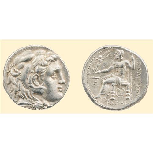 AR Tetradrachm (17.10 g). Seleukia in Pieria. Ca. 300 BC. Head of young Herakles right, wearing lion skin / <SPAN STYLE=`FONT-SIZE:10.0PT;FONT-FAMILY:SYMBOL;COLOR:#333333`>SELEUKOU BASILEWS</SPAN>, Zeus enthroned left, holding Nike and scepter, monogram to left, monogram in circle below throne. SC 29.2.