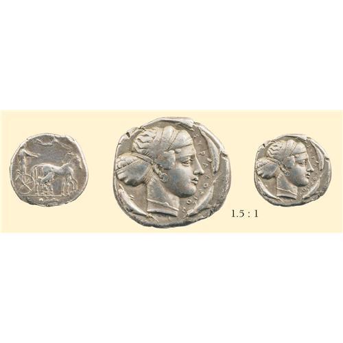 AR Tetradrachm, 466-405 BC (16.43 g). Charioteer driving quadriga to right, Nike flying right above, crowning his horses, leaf in exergue / SURAKOSION, head of Arethusa right, hair tied together in a sakkos, four dolphins around. Franke-Hirmer 94; Boehringer 820; cf. Rizzo, pl. XL, 15 and pl. XL,16 which shows an enlargement of a specimen struck from the same reverse die. A superbly balanced and strikingly classical die, this particular rendering has been seen by Rizzo in his Saggi Preliminari, p. 41 ff., fig. 26 ff. as a close numismatic parallel to the work on the Parthenon in Athens. He rightly points out the similarity between the style of this particular obverse die and the head of Artemis located on the Parthenon`s east frieze (slab E iv.40). A rare and art historically important coin.