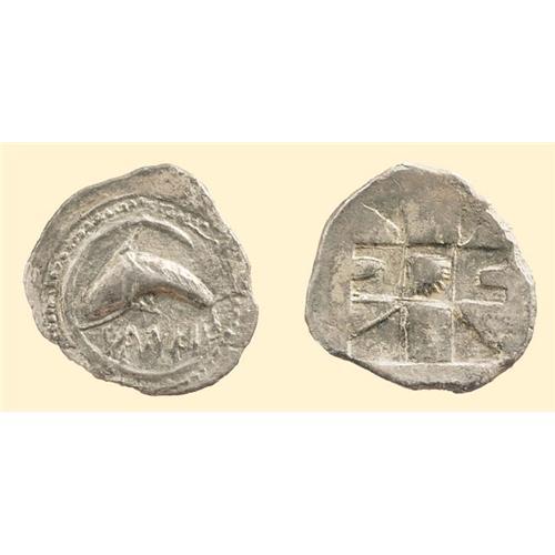 AR Chalcidian Drachm (4.64 g). Ca. 500-495 BC. <SPAN STYLE=`FONT-SIZE:10.0PT;FONT-FAMILY:SYMBOL;COLOR:#333333`>ZANKLE</SPAN>, dolphin left above ethnic, within sickle-shaped harbor; shallow incuse square decorated with mussel shell and various raised geometric patterns. SNG ANS 300-301. Basel 359.