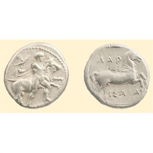 AR Drachm (5.80 g). 435-400 BC. Youth to left, restraining bull / <SPAN STYLE=`FONT-SIZE:10.0PT;FONT-FAMILY:SYMBOL;COLOR:#333333`>LAR-ISAIA</SPAN>, horse prancing right, within shallow incuse square. Dewing 1389.