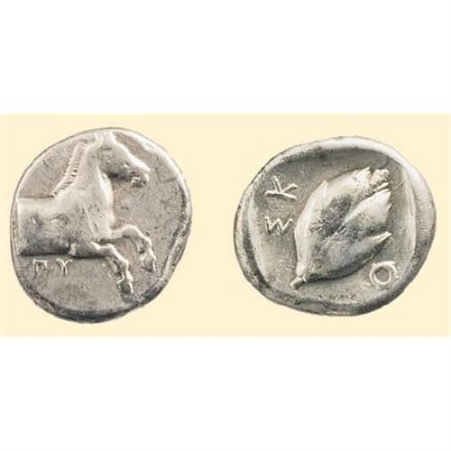 AR Drachm (5.94g). Ca. 480-450 BC. Forepart of rearing horse right, <SPAN STYLE=`FONT-SIZE:10.0PT;FONT-FAMILY:SYMBOL;COLOR:#333333`>P</SPAN>Y below / <SPAN STYLE=`FONT-SIZE:10.0PT;FONT-FAMILY:SYMBOL;COLOR:#333333`>SKO</SPAN>, grain of wheat, all in deep incuse square. BMC-. SNG Cop.-. Weber-.