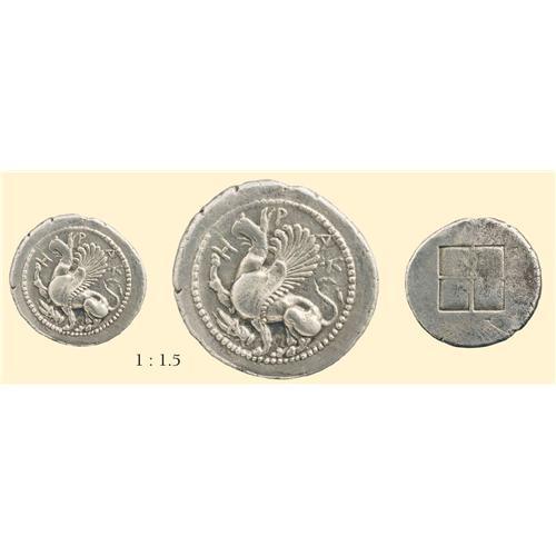 AR Tetradrachm (14.13 g). 520-492 BC. <SPAN STYLE=`FONT-SIZE:10.0PT;FONT-FAMILY:SYMBOL;COLOR:#333333`>HRAK</SPAN>, gryphon standing left, his right paw raised, grasshopper in front, all within dotted border / shallow quadripartite incuse square. Dewing 1253 var.