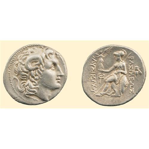 AR Tetradrachm (16.76 g). Ca. 288-282 BC. Amphipolis. Diademed head of deified Alexander the Great right, with the horn of Ammon / BASILEWS / LUSIMACOU, Athena enthroned left, holding Nike as she crowns Lysimachos` name, caduceus to left, bee in exterior left field. Thompson 190.