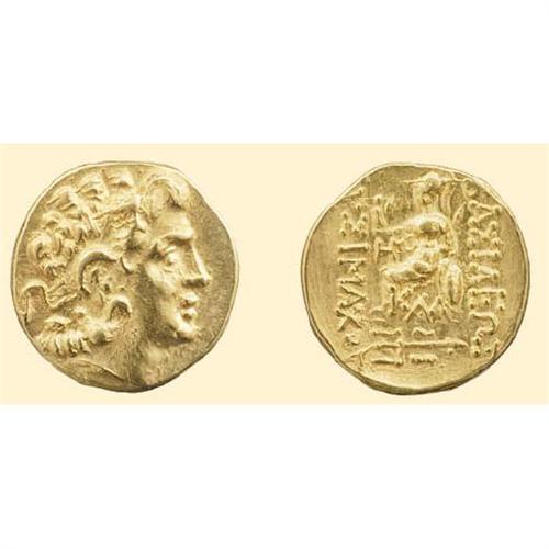 AV Stater (8.23 g). Early 1st century BC. Kallatis. Diademed head of deified Alexander the Great right, with the horn of Ammon / BASILEWS / LUSIMACOU, Athena enthroned left, holding Nike as she crowns Lysimachos` name, P monogram left, KAL on throne, trident in exergue. Callataÿ D6-R2 (same dies).
