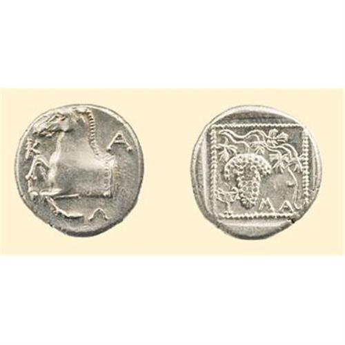 AR Persic Drachm or Tetrobol (2.81 g). Ca. 400-350 BC. Forepart of bounding horse left, magistrate`s name around / grape cluster on vine, kantharos to l., MA to r., all in dotted square set in shallow incuse. May 386. SNG Cop.-. BMC-. Dewing-.