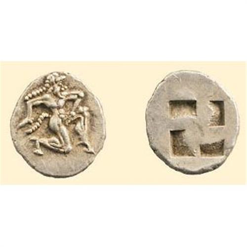 AR Diobol (1.15 g). Ca. 530-480 BC. Nude satyr running right / quadripartite incuse square. Rosen 144 (as Thasos); SNG Cop. 192 (as "Lete").