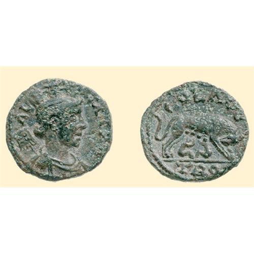 AE As (5.00 g). Ca. 250-260 AD. ALEXANDRIA, bust of the city goddess with mural crown / COL AVG / TROA, she-wolf giving milk to Romulus and Remus. Bellinger (Troy), A 494.