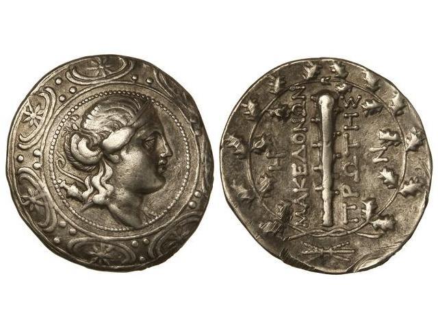 GREEK COINS - Tetradracma. 158-149 a.C. AMPHIPOLIS. MACEDONIA. Anv.: Busto de Artemisa a derecha, sobre escudo macedonio. Rev.: Clava vertical, a izquiera y derecha leyenda. 16,30 grs. AR. (Limaduras en canto). Se-1386 var. MBC+.