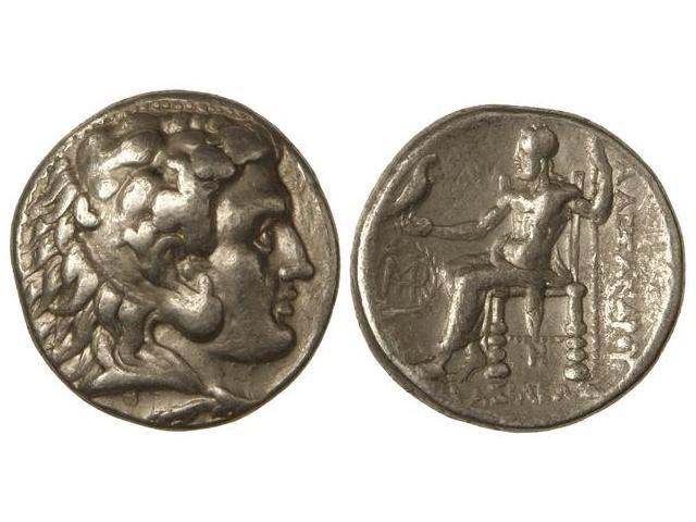 GREEK COINS - Tetradracma. ALEJANDRO MAGNO. MACEDONIA, TRACIA, TESALIA. Anv.: Cabeza de Hércules con piel de león a derecha. Rev.: Zeus entronizado a izquierda, alrededor leyenda y monogramas. 16,90 grs. AR. MÜller-714. MBC+/MBC-.