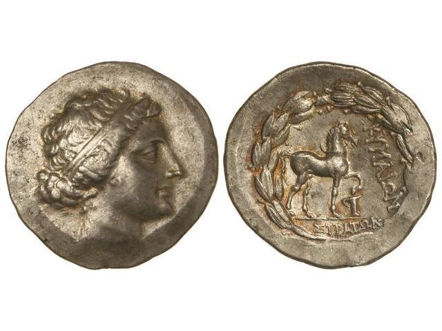 GREEK COINS - Tetradracma. Siglo II a.C. KYME. Anv.: Cabeza de la amazona Kyme a derecha. Rev.: Caballo a derecha, delante y debajo leyenda, todo dentro de corona de laurel. 16,50 grs. AR. Se-4183 var. EBC-/EBC.