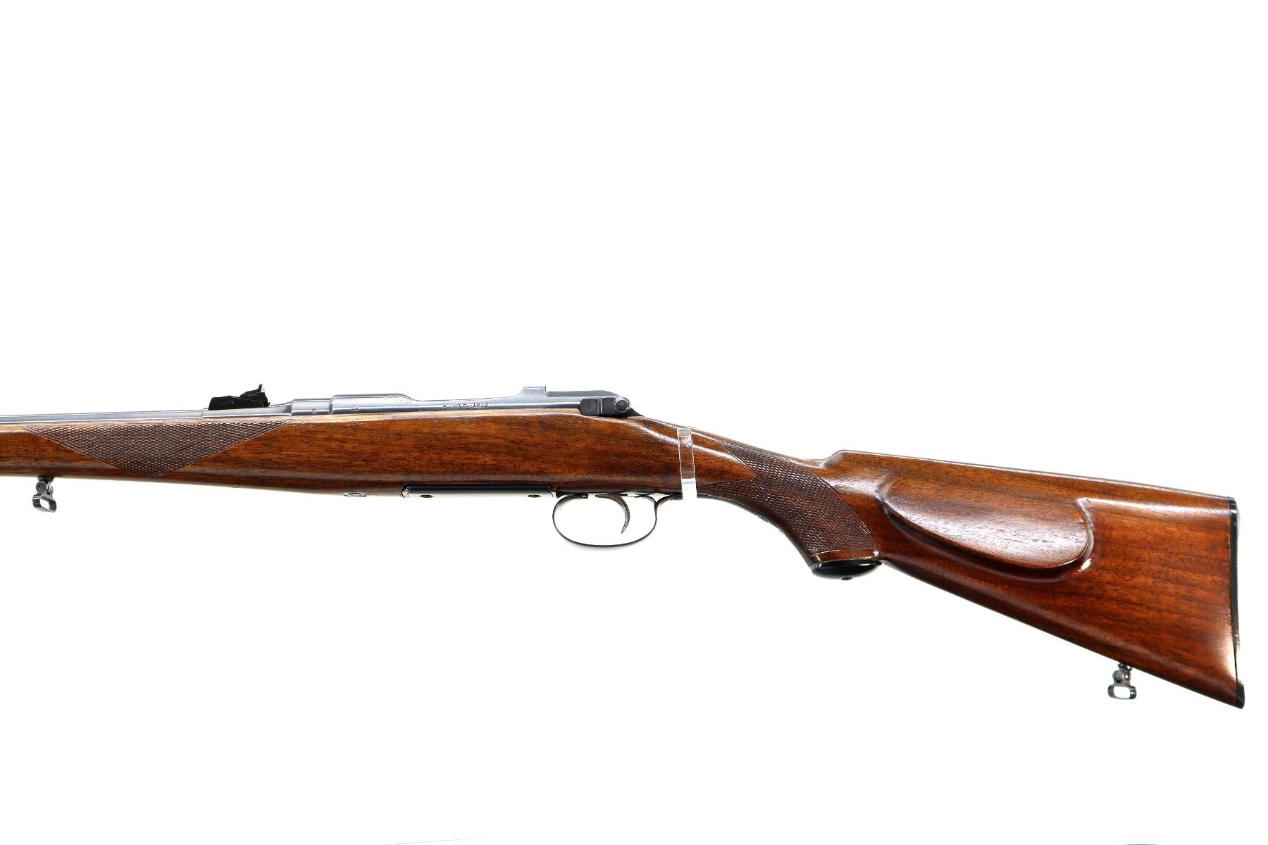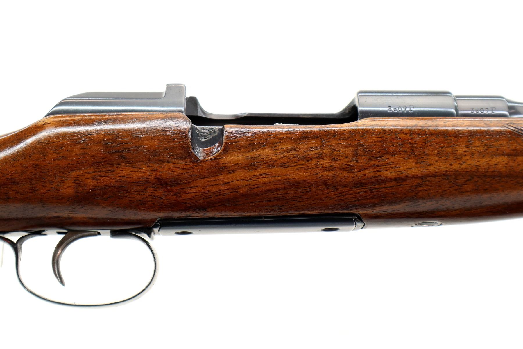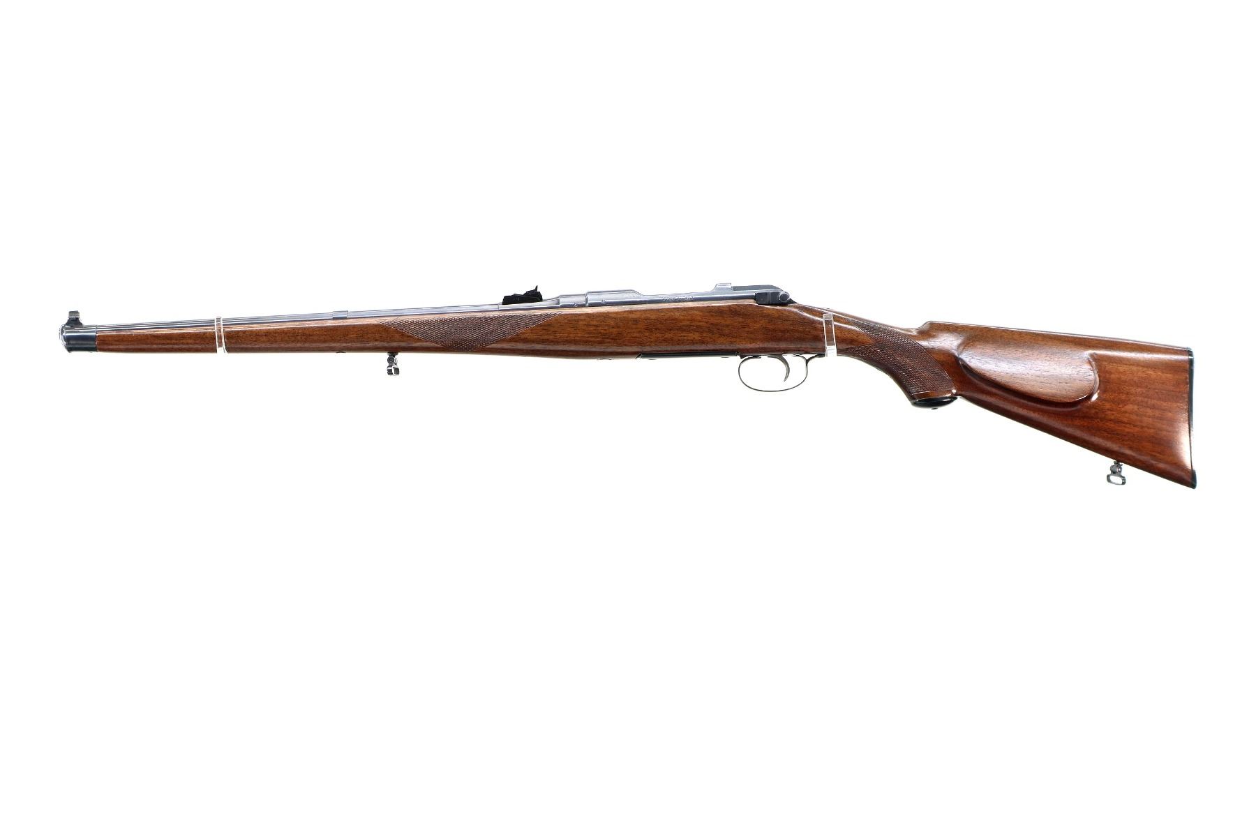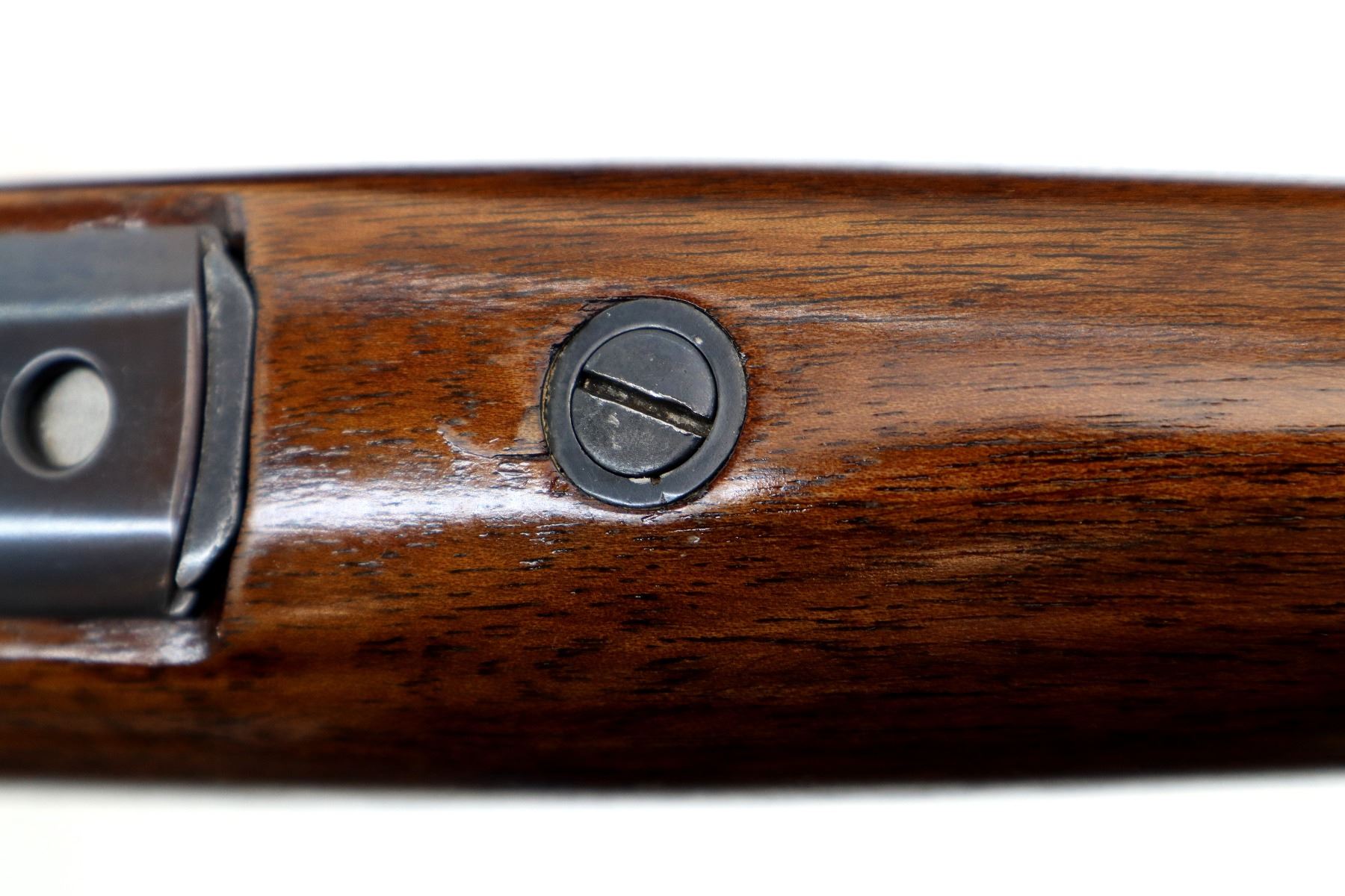 Main Description: Blade front sight with ramp, adjustable u notched rear sight, metal has been polished and reblued with some pitting underneath, missing complete bolt assembly. One piece full length wood stock, checkered forearm and pistol grip, European cheek rest, checkered black polymer butt plate, grip cap, small crack in front of trigger guard assembly, sling swivels, steel nose cap.