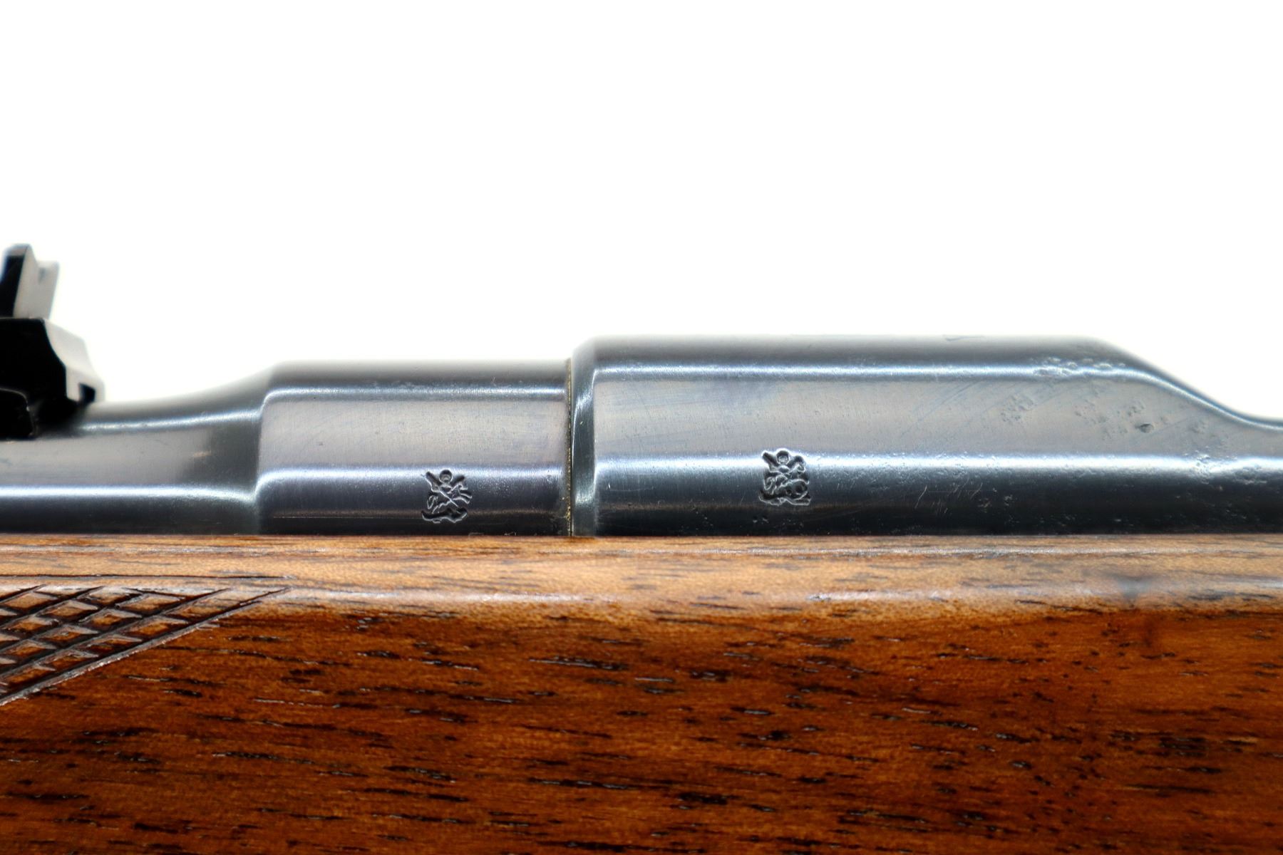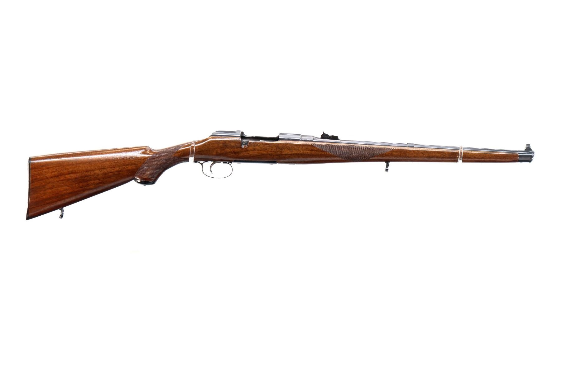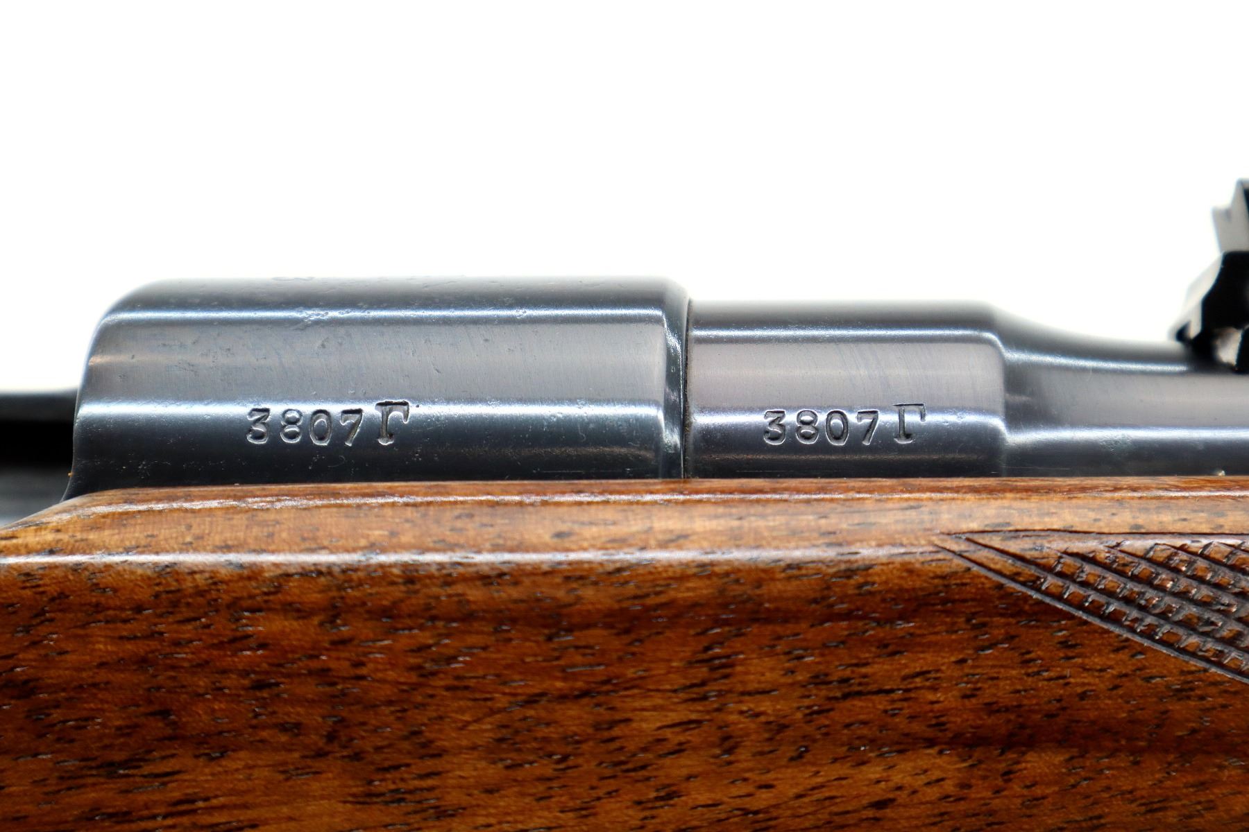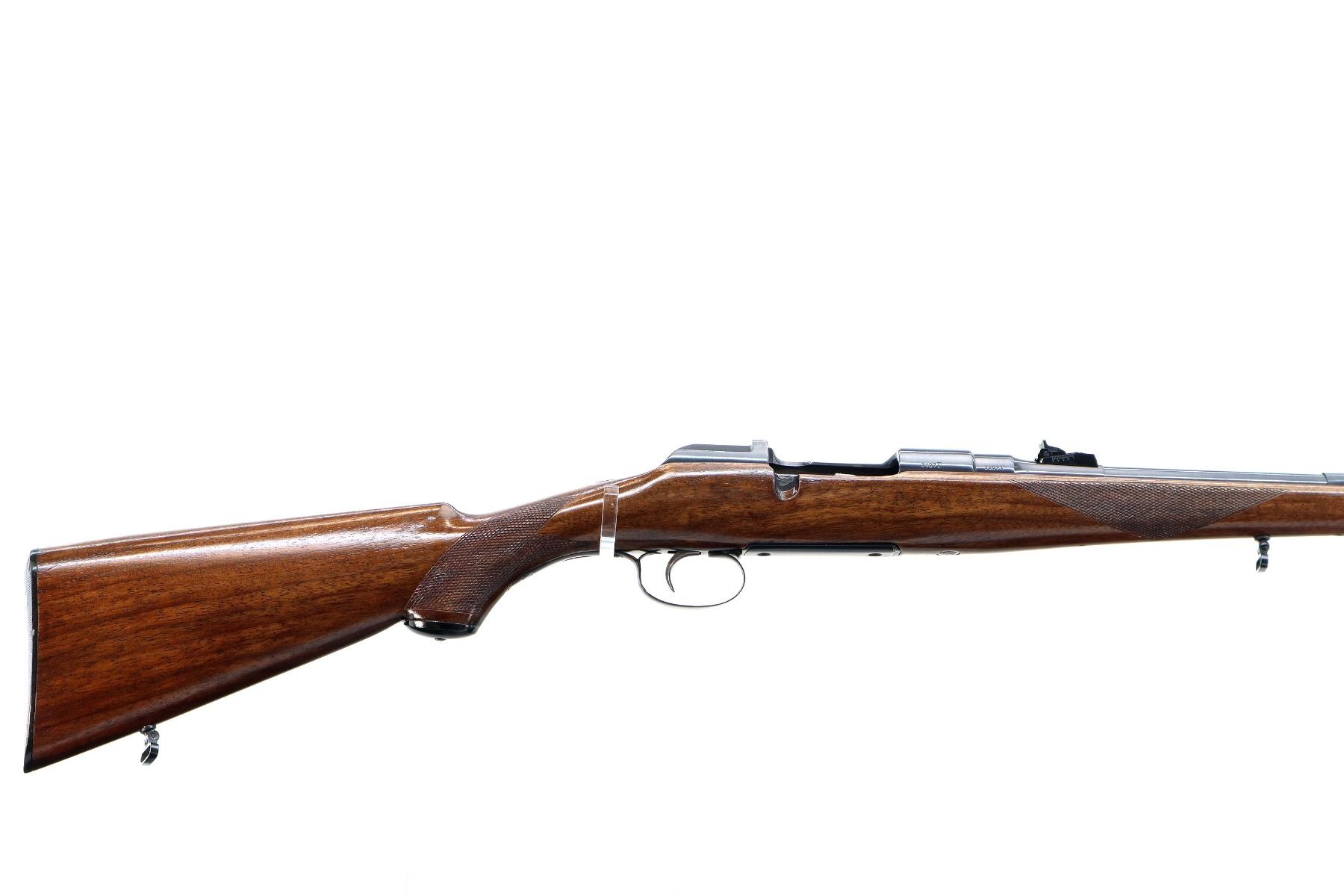Main Description: Blade front sight with ramp, adjustable u notched rear sight, metal has been polished and reblued with some pitting underneath, missing complete bolt assembly. One piece full length wood stock, checkered forearm and pistol grip, European cheek rest, checkered black polymer butt plate, grip cap, small crack in front of trigger guard assembly, sling swivels, steel nose cap.