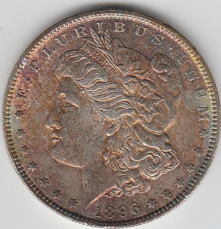 GREEN AND BLUE TONED 1896 $1 SILVER MORGAN STUNNING UNC