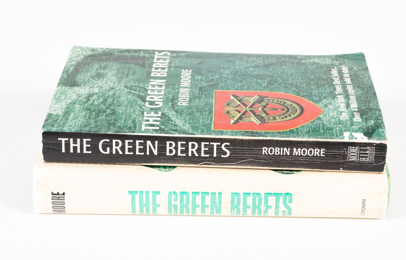 Lot of two Robin Moore books. 'The Green Berets', by Robin Moore, Moore Hill Publishing, 1999, paperback, signed by Moore on title page, 394 pages. 8 x 5 inches. 'The Green Berets', by Robin Moore, Crown Publishers, Inc., 1965, hardcover, 348 pages. 8.5 x 6 inches.