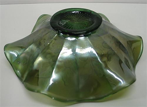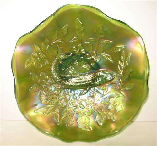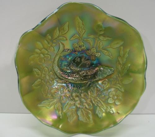 MILLERSBURG GREEN CARNIVAL GLASS BOWL. Fluted top. Trout and fly pattern. 2.5" H, 8" Dia.