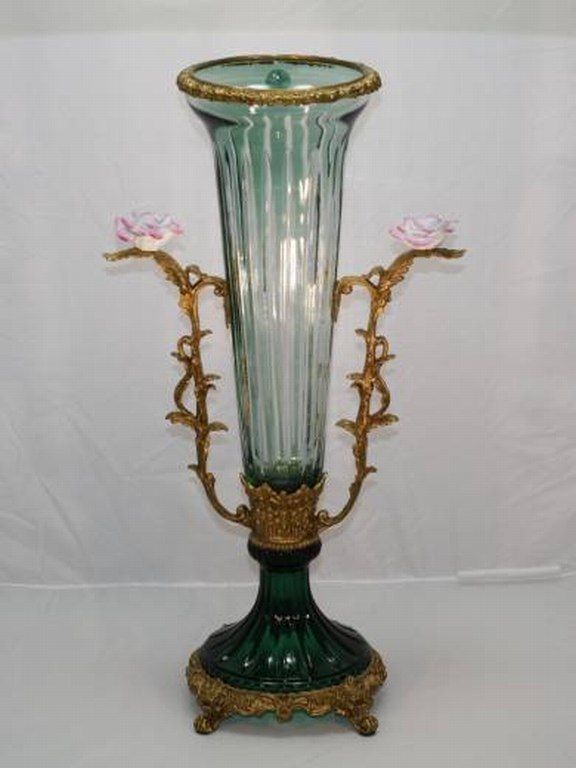 FINE ITALIAN GREEN HAND CUT CRYSTAL VASE WITH BRASS ACCENTS AND PORCELAIN FLOWERS - 109.8L" x 5.3W" x 16.9H"