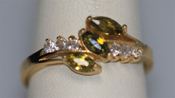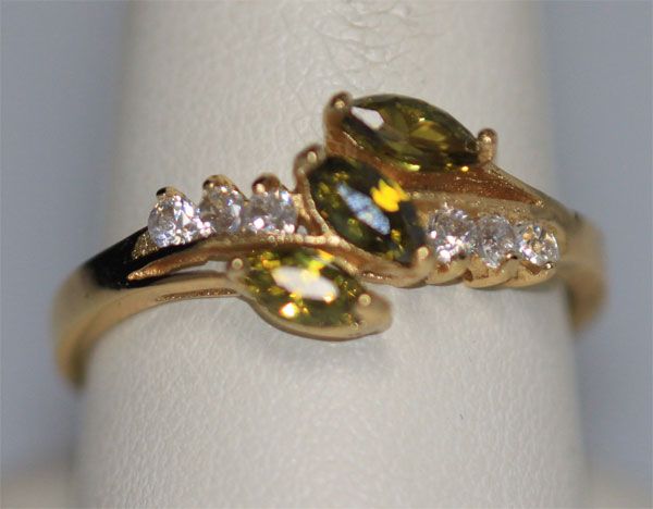GREEN CZ AND CZ 14K GOLD PLATED RING **|**|** GREEN CZ AND CZ 14K GOLD PLATED RING ; METAL BRASS; BRAZILIAN JEWELRY; 14K GOLD PLATED ; MSRP: $0