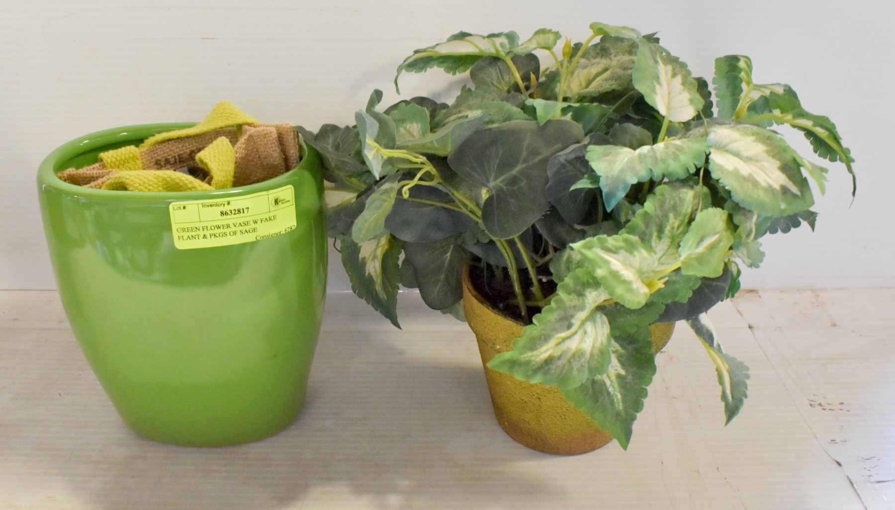 GREEN FLOWER VASE W FAKE PLANT & PKGS OF SAGE