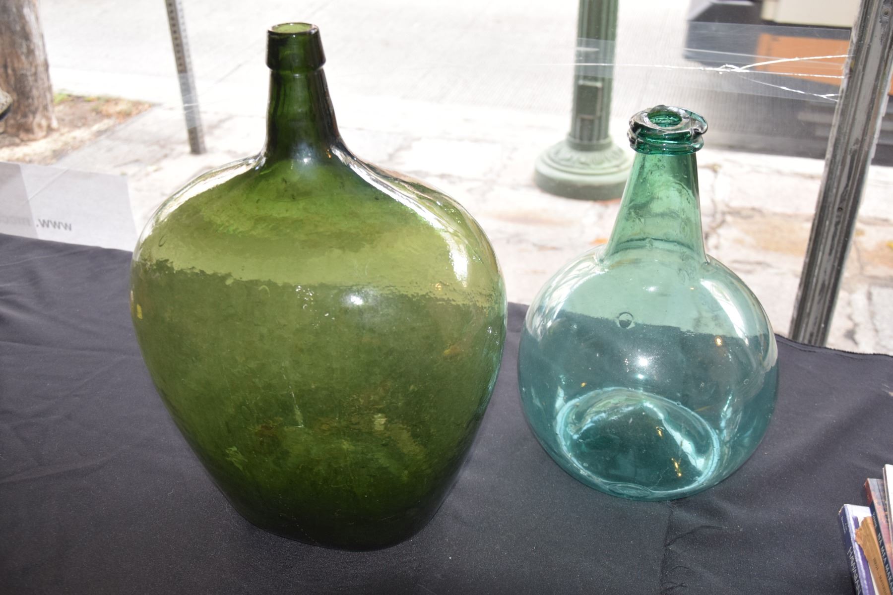 GREEN GLASS WINE TRANSPORTATION BOTTLE, PRE 1900'S (18") & HAND BLOWN ANCIENT GLASS BOTTLE (C. 1800