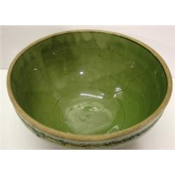 Green glazed art pottery mixing bowl. Overall condition is good. 6.25" H, 11.5" Dia.