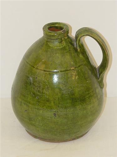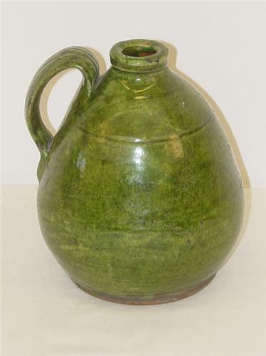 GREEN GLAZED REDWARE JUG - BULBOUS BODY W/ SINGLE TOOLED LINE ON THE SHOULDER & 1 HANDLE W/ 3 RAISED RIBS (6 1/4" T X 5 1/4" W) - WEAR, SEVERAL GLAZE CHIPS ON BODY & RIM, IMPERFECTIONS