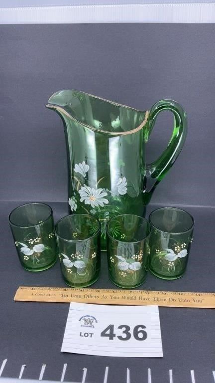 GREEN HAND PAINTED VICTORIAN LEMONADE PITCHER, 4